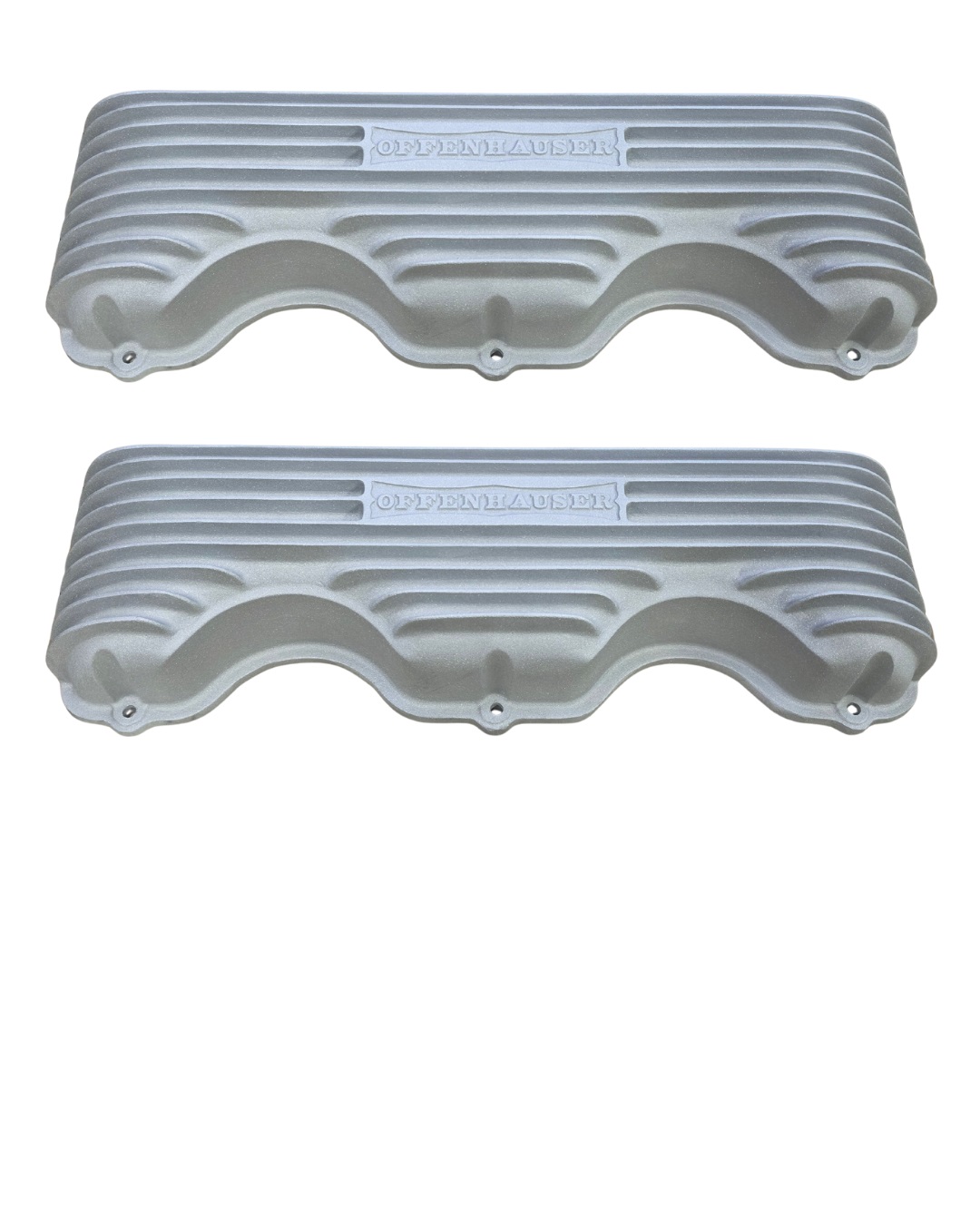 The Offenhauser 5042 valve covers are designed for Chevy 348 and 409 engines. They are made from cast aluminum and feature a classic finned design. The covers are available in polished and non-polished finishes. Non-polished covers are a sandblasted finish so you can easily customize them with high-temperature paint if you prefer a black-and-aluminum look. These valve covers offer both durability and a classic appearance that matches the era of W-series Chevrolet engines.